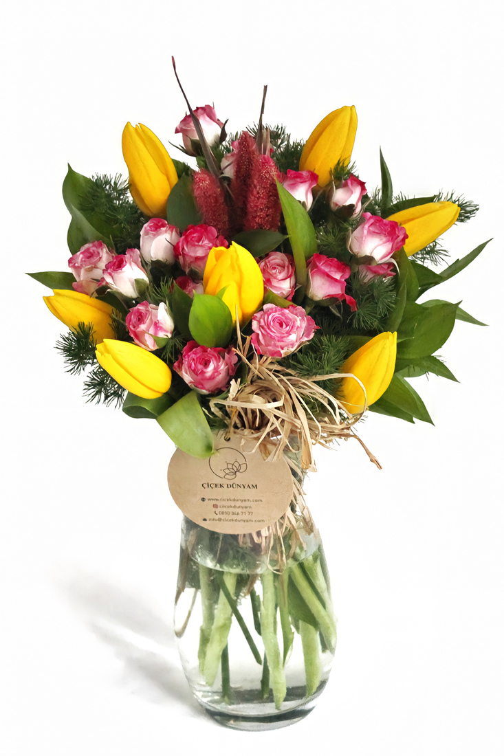 Bionda Çiçek Dünyam profesyonel dizayn ekibi tarafından siz değerli müşterilerimizin beğenisine sunulmakatdır.Tarzı ve renkleri itibari ile oldukça şık ve gösterişli bir üründür.Sarı laleler ve pembe çardak güller ile hazırlanmış bir üründür.Hemen çiçeksepetinize ekleyerek ona unutamayacağı bir an yaşatmaya ne dersiniz?