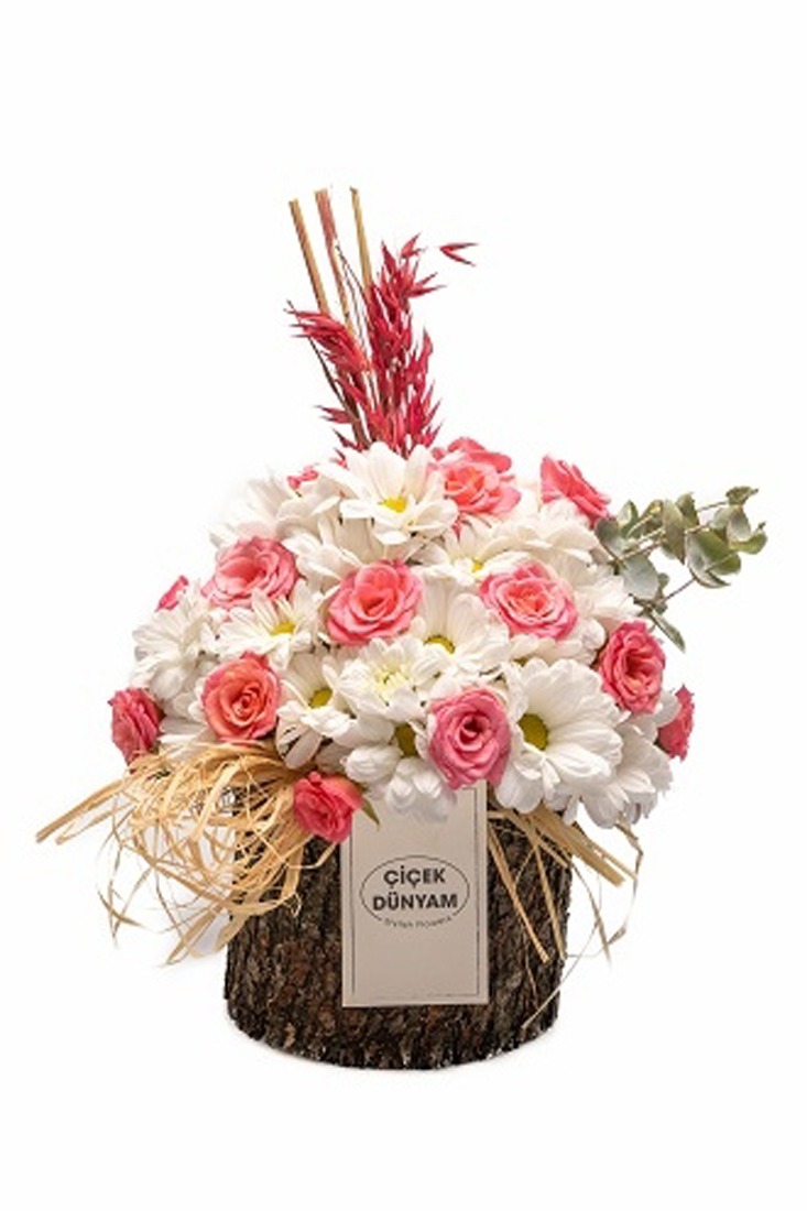 İşlenmemiş doğal ahşap kütük üzeri çalışılmış enfes papatylalar ve pembe çardak gül kombinasyonu siz değerli müşterilerimizin beğenisine sunulmaktadır.En tazeçiçekler ile hazırlanmakta olan FULL OF LOVE en değerli anlara anlam katacak ve sevginizi sunmanın en anlamlı halidir.
